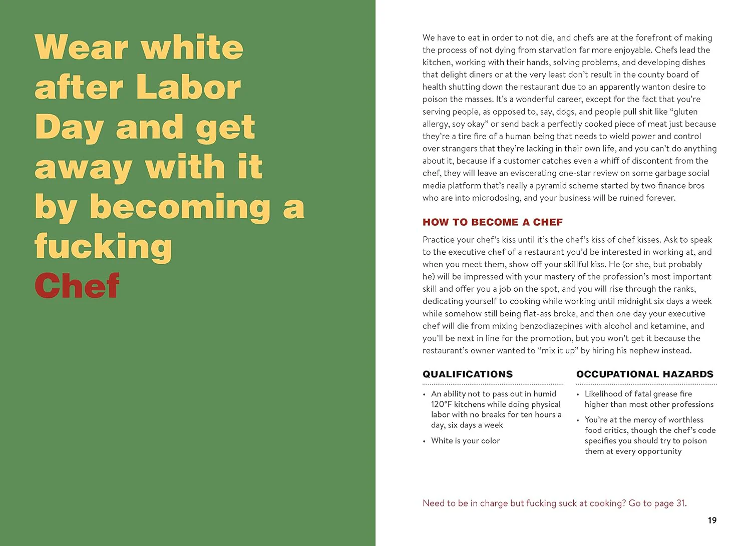 If you've tried and failed to find your purpose in life, you're going to need expert help. From the author of What the F*ck Should I Make For Dinner?, this laugh-out-loud career guide will set you straight. Take a brief career quiz to find your perfect match, and get the inside scoop on a wide variety of crappy careers, plus tips on breaking in, leaving you with no excuse not to embark on a fulfilling vocation as: