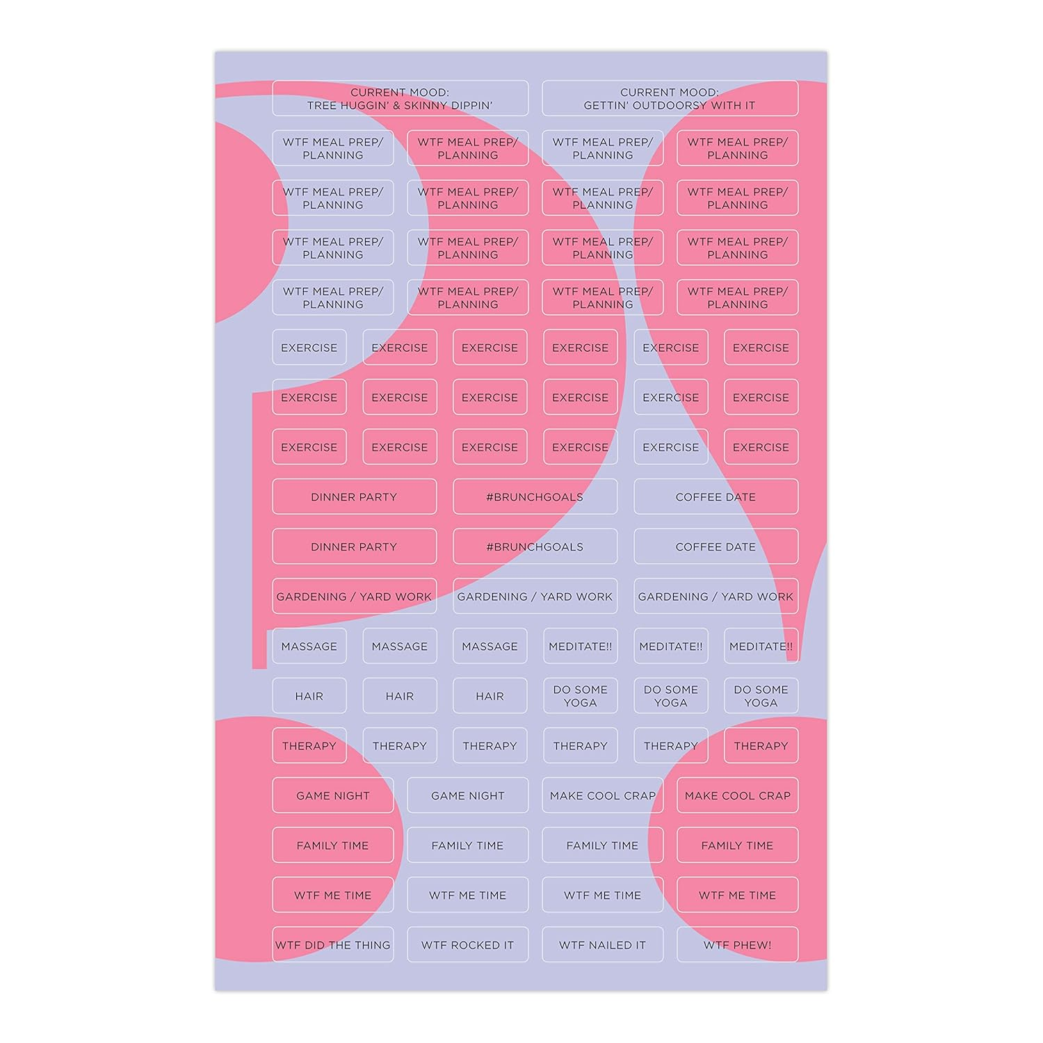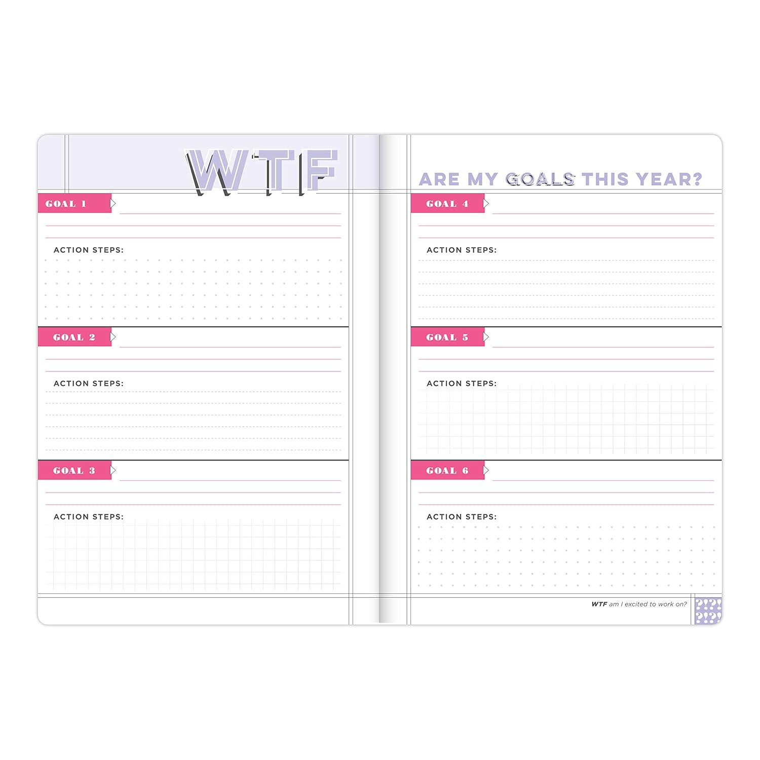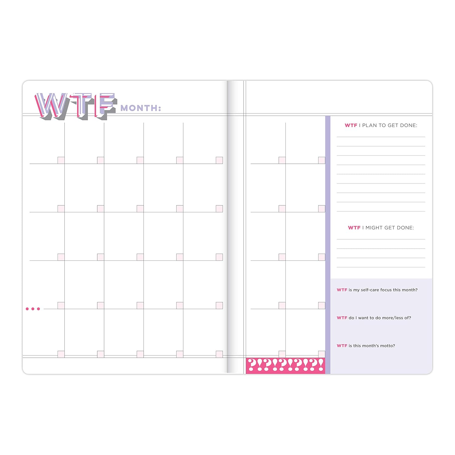 Figure out WTF you want (and need) to do! This planner without dates will help you set goals, take care of yourself, and get crap donefor a whole WTFin' year. Inside its got: 12 undated monthly calendars + 60 undated weekly calendars + goal-setting prompts and self-care tools + over 200 stickers. Not to mention, like 500 WTFs. Bam!