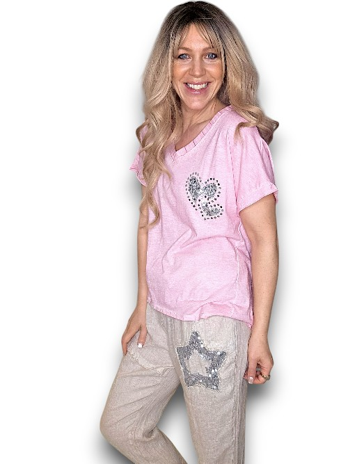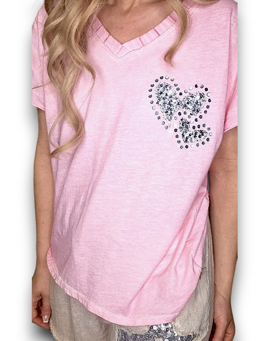 V-neck, stretchy, short-sleeve cotton top. Featuring diamante/sequin heart design.