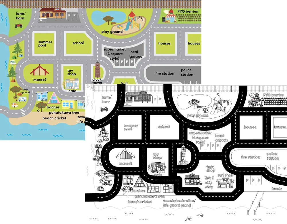 Includes a paper colouring-in kiwiana town playmat!