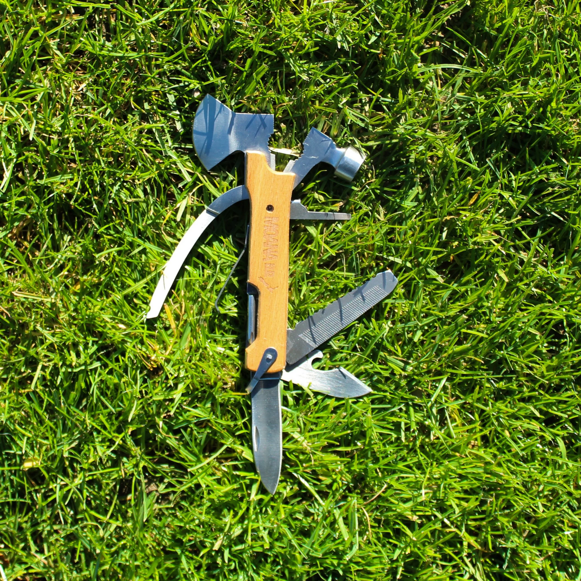 Regular Plier - Flat Nose Plier - Hammer - Small Flat Screwdriver - Can Opener & Bottle Opener - Saw & Nail File - Big Flat Screwdriver - Knife - Phillips Screwdriver - Wire Cutter - Axe
