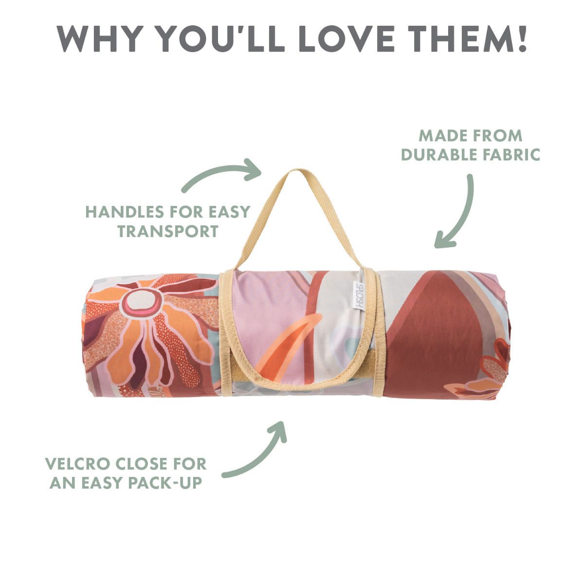 Large picnic rug with handle, waterproof backing and velcro close in a custom print design