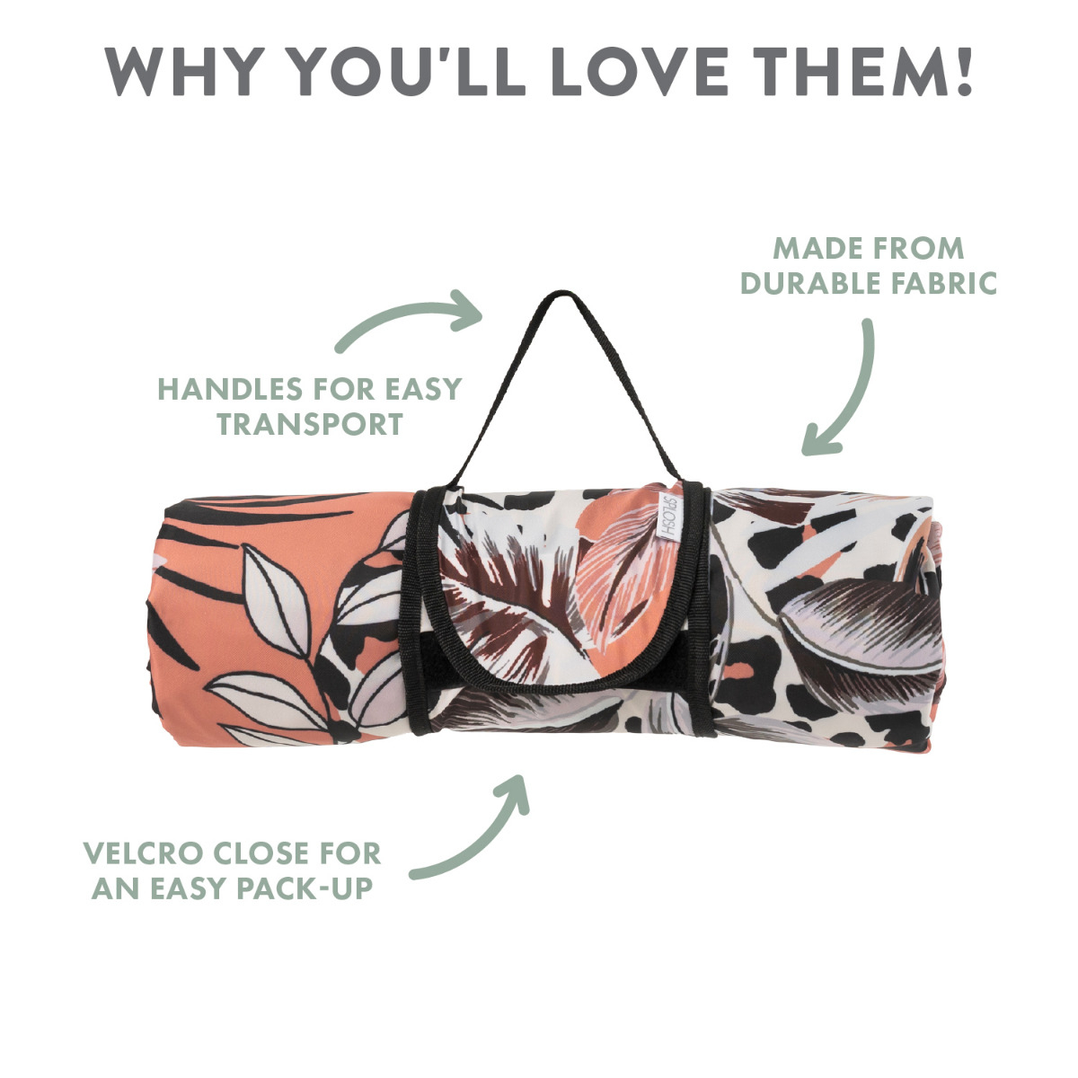 Large picnic rug with handle, waterproof backing and velcro close in a custom print design