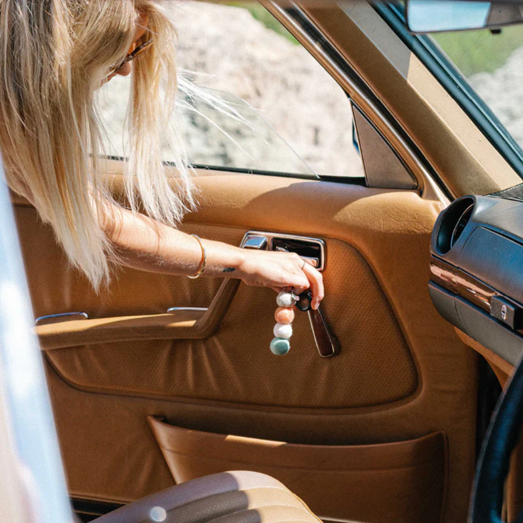 4 Unscented Felt Balls with branded charm and elastic string for easy hanging.